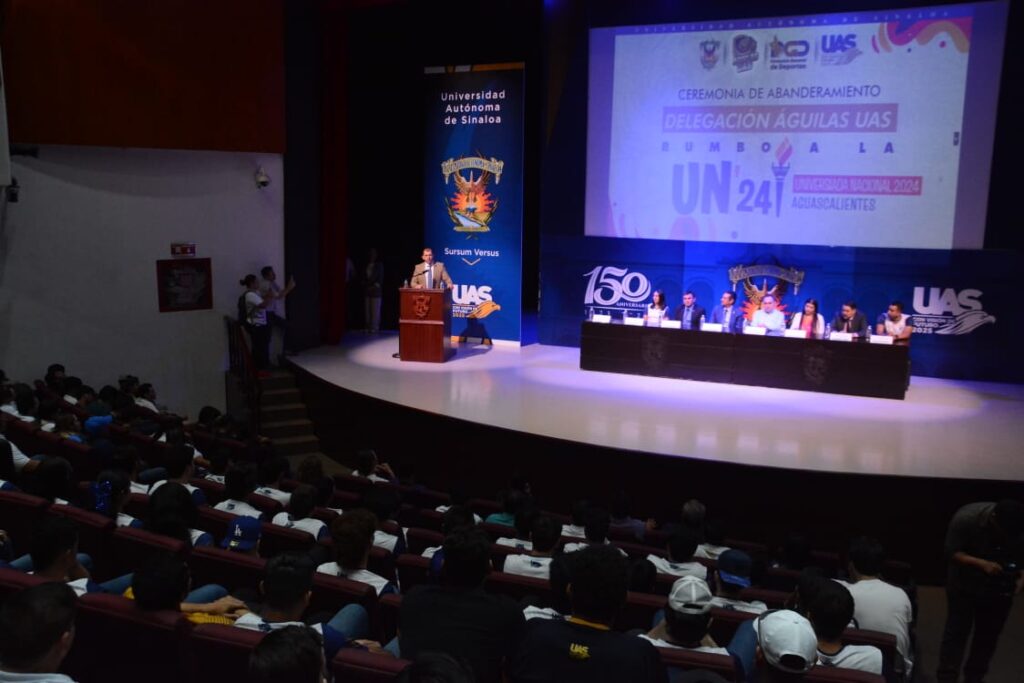 La Universidad Autónoma de Sinaloa (UAS) sigue demostrando que es un bastión en la formación integral de los jóvenes pues autoridades de la institución abanderaron a la Delegación Águilas UAS integrada por 335 deportistas que saldrán rumbo a la Universiada Nacional 2024 a realizarse en Aguascalientes, estableciendo así un nuevo récord histórico de deportistas que defenderán el color azul y oro.