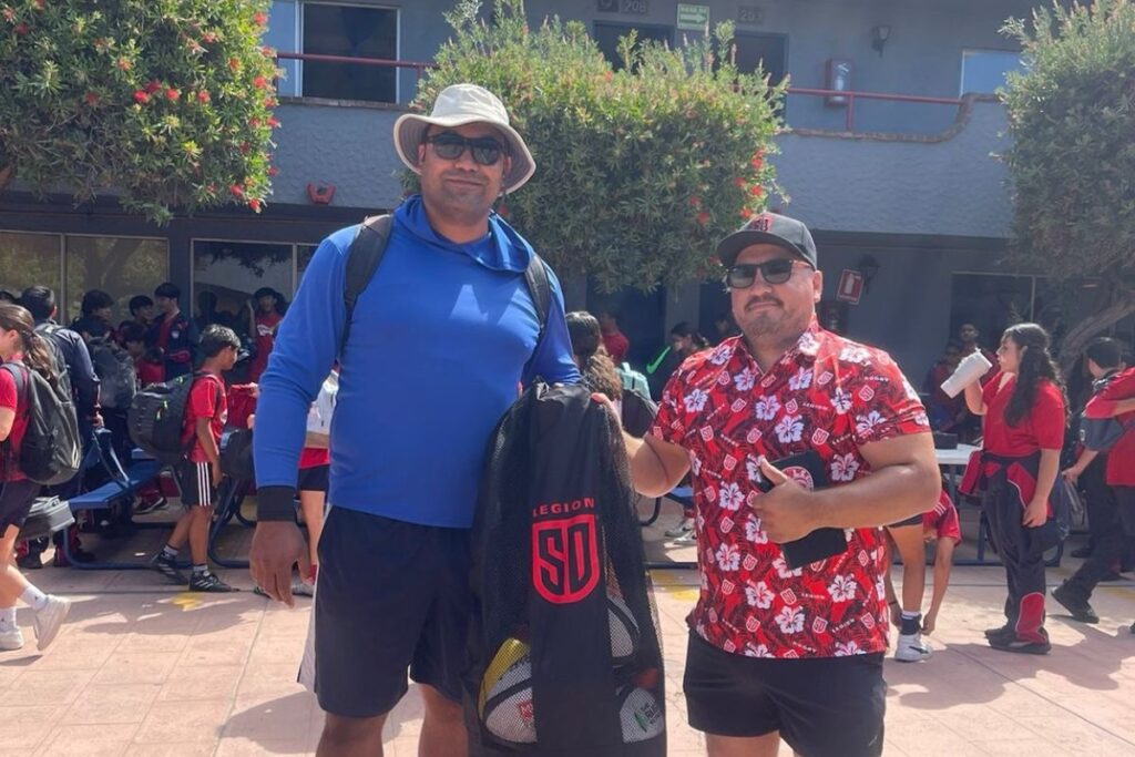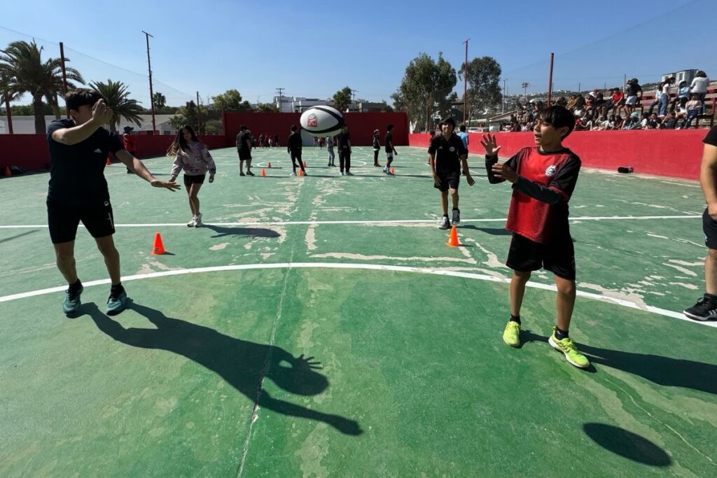Los entrenadores de Tijuana, Mariel , Guillermo Amaya y Eduardo, del Staff Deportivo de San Diego Legion y miembros de Cuervos Tijuana Rugby Club en la Frontera, impartieron las primeras clases en ambas instituciones educativas de Tijuana.