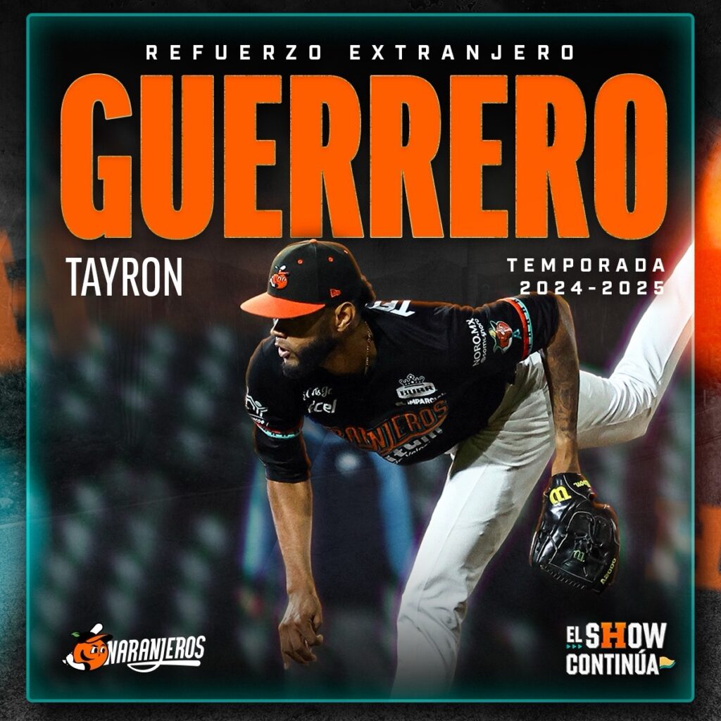 El relevo de los campeones Naranjeros de Hermosillo contará para la temporada 2024-2025 de la Liga ARCO Mexicana del Pacífico con el regreso del lanzador colombiano Tayron Guerrero